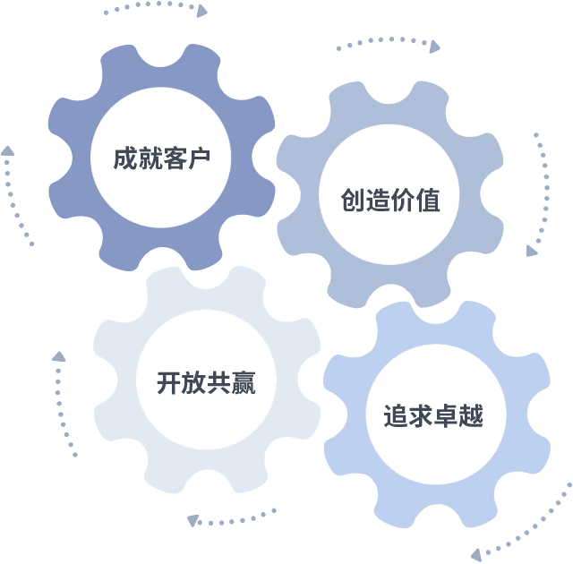 成就客户是一切决策的出发点,,创造价值是衡量所有工作的标准,,,追求卓越是我们做事做人的态度,,,开放共赢是我们的格局也是最终的结果。。。价值观的齿轮环环相扣,,,推动着组织里的每个人不断向前。。