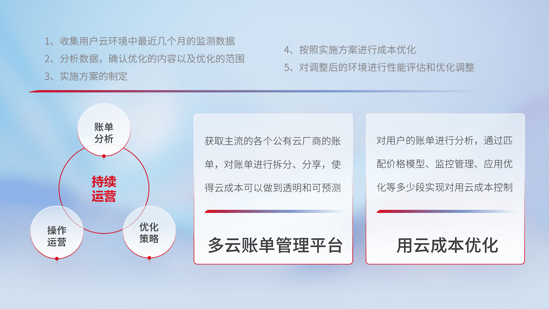 通过多云纳管,,,以统一的资源数据模型把客户的云资源进行抽象和封装,,进而实现对多云资源的统一操作,,,,保障云资源管理的可靠性、、、稳定性与可用性。。量身定制化运维内容,,,,配置、、、开发运维、、补丁管理、、、、备份、、、、监控、、、认证和访问管理、、、审计和日常巡检等,,保障在用云过程中的可靠度,,,,稳定度以及高可用率。。