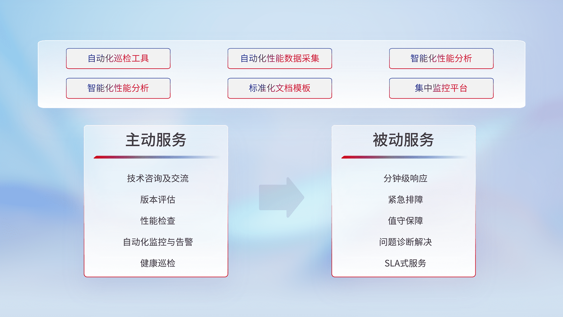 智能化工具和标准化文档,,保障服务质量,,提供主动服务(包含技术咨询、、版本评估、、性能检查、、自动化监控与告警、、健康巡检)和被动服务包含(分钟级响应、、、、紧急排障、、、、值守保障、、、问题诊断解决、、SLA服务)。。。